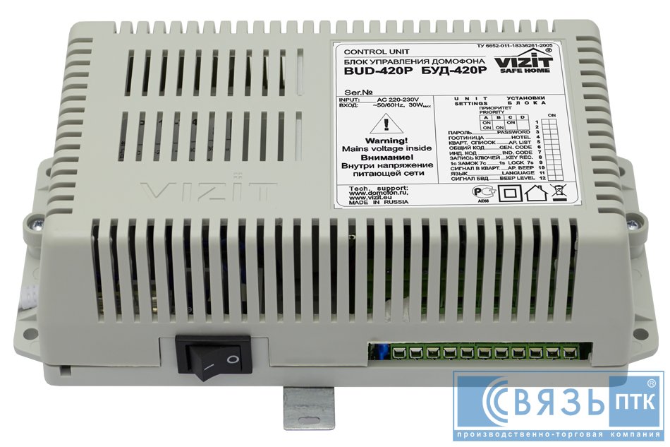 Блок управления домофона БУД-420Р, совместно с блоком вызова БВД-432RCB и несколькими блоками коммутации БК-401 предназначен для создания системы контроля доступа на придомовую территорию ("VIZIT 8+1" - один вход на терриротию, "VIZIT 8+2" - два входа на территорию). Система интегрирует до 8 многоабонентских домофонов/видеодомофонов VIZIT, установленных в подъездах внутри огороженной территории и один или два комплекта БВД432RCB + БУД-420Р, установленные на входе в огороженную придомовую территорию.